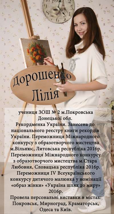 Лілія Дорошенко – школярка з Покровська Донецької області, багаторазова учасниця персональних виставок. Здобула перемогу на міжнародних конкурсах у Литві та Словаччині. Нещодавно занесена до національного реєстру України у книгу рекордів України як автор ідеї проведення Всеукраїнської акції «За мир та щастя в Україні».