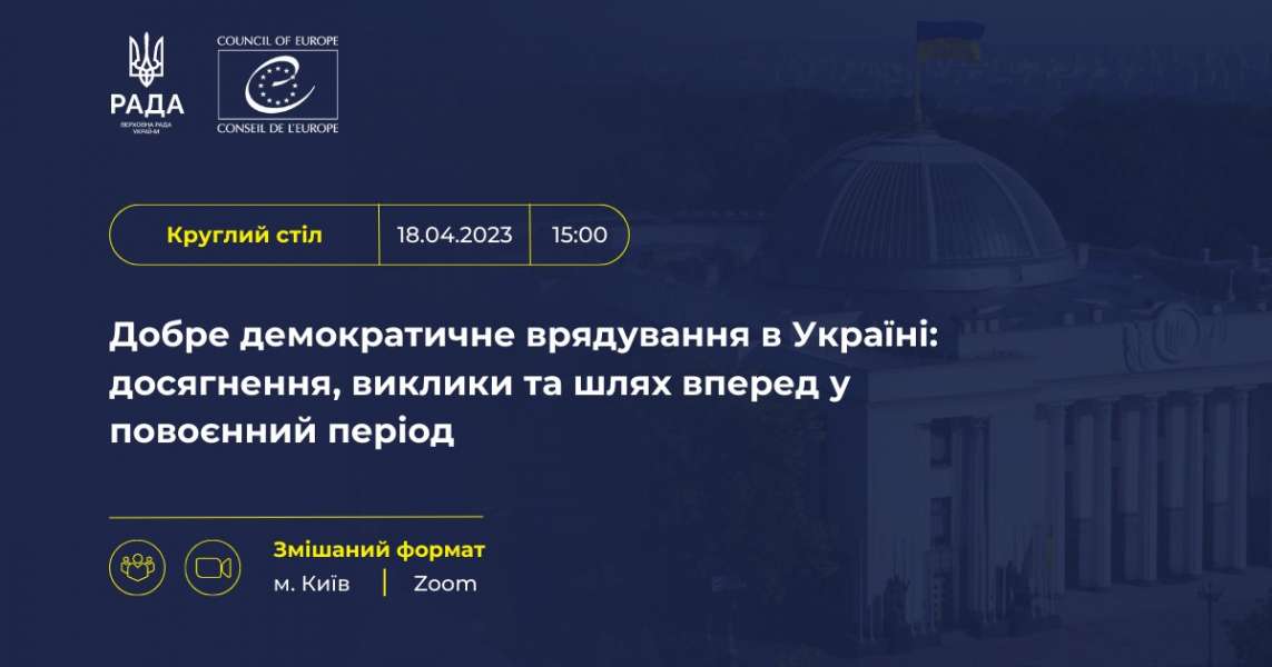 Комітет Верховної Ради України з питань організації державної влади, місцевого самоврядування, регіонального розвитку та містобудування проведе круглий стіл на тему: «Добре демократичне врядування в Україні: досягнення, виклики та шлях вперед у повоєнний період».