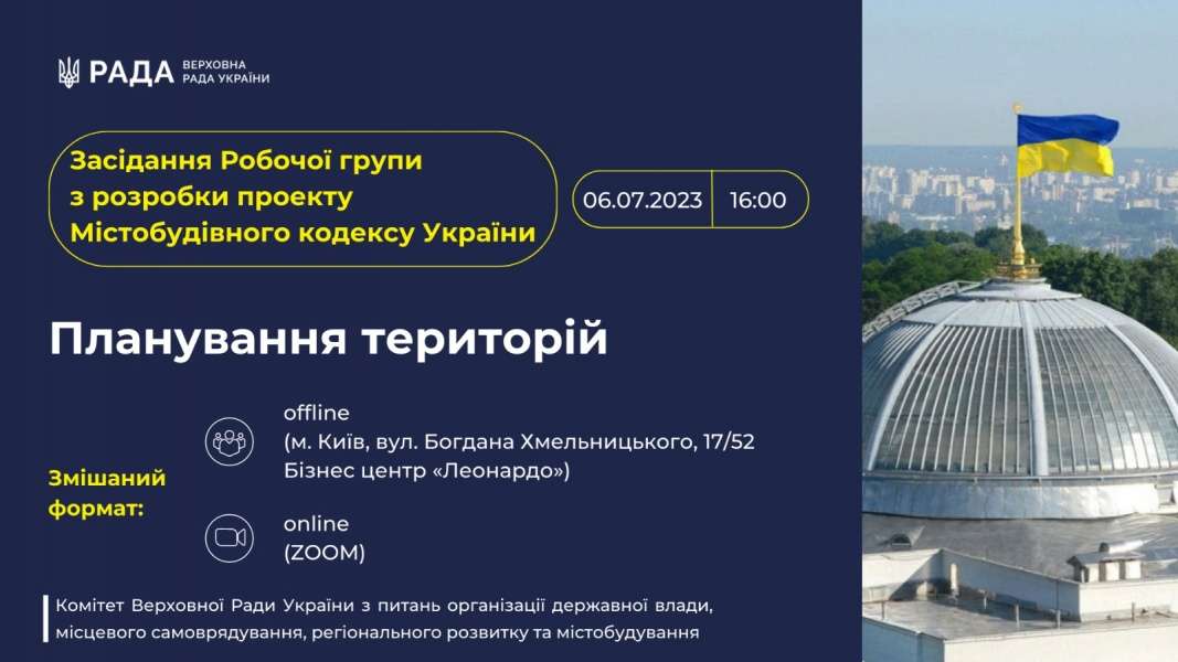 «Планування територій» - тема шостого засідання робочої групи Комітету Верховної Ради України з питань організації державної влади, місцевого самоврядування, регіонального розвитку та містобудування з розробки проекту Містобудівного кодексу України.