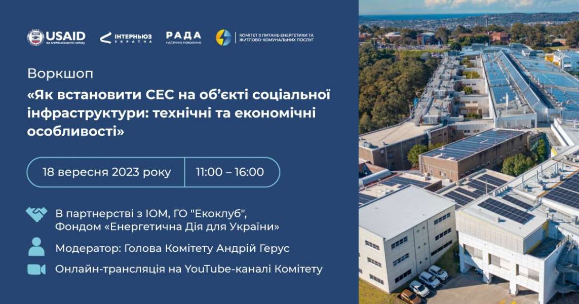 Комітет Верховної Ради України з питань енергетики та житлово-комунальних послуг у співпраці з Міжнародною організацією з міграції, ГО «Екоклуб» та БО «Фонд «Енергетична Дія для України», за підтримки Програми USAID «РАДА: наступне покоління», проводитиме воркшоп щодо реалізації проектів розподіленої генерації з ВДЕ, їх технічних особливостей та можливостей фінансування.