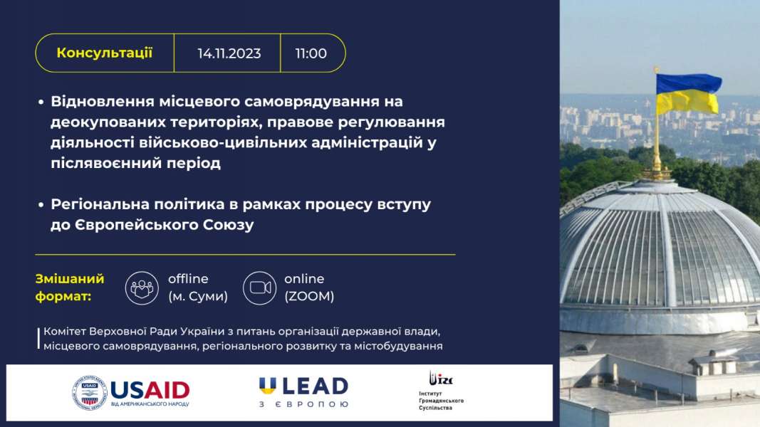 Комітет Верховної Ради України з питань організації державної влади, місцевого самоврядування, регіонального розвитку та містобудування проведе консультації на теми: «Відновлення місцевого самоврядування на деокупованих територіях, правове регулювання діяльності військово-цивільних адміністрацій у післявоєнний період» та «Регіональна політика в рамках процесу вступу до Європейського Союзу».