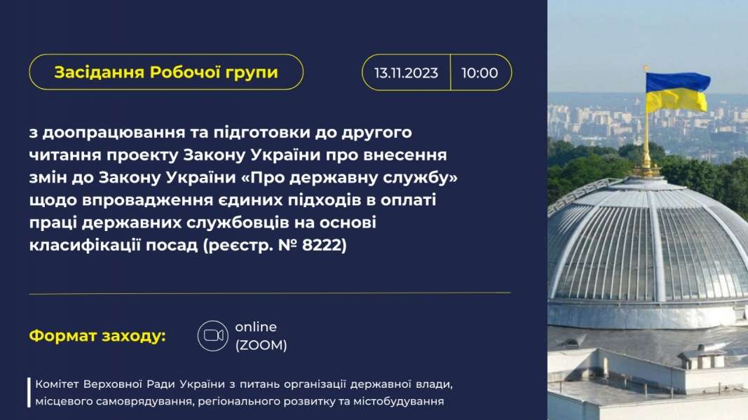 У Комітеті Верховної Ради України з питань державної влади, місцевого самоврядування, регіонального розвитку та містобудування відбудеться засідання Робочої групи з доопрацювання та підготовки до другого читання проекту Закону України про внесення змін до Закону України «Про державну службу» щодо впровадження єдиних підходів в оплаті праці державних службовців на основі класифікації посад (реєстр. №8222).