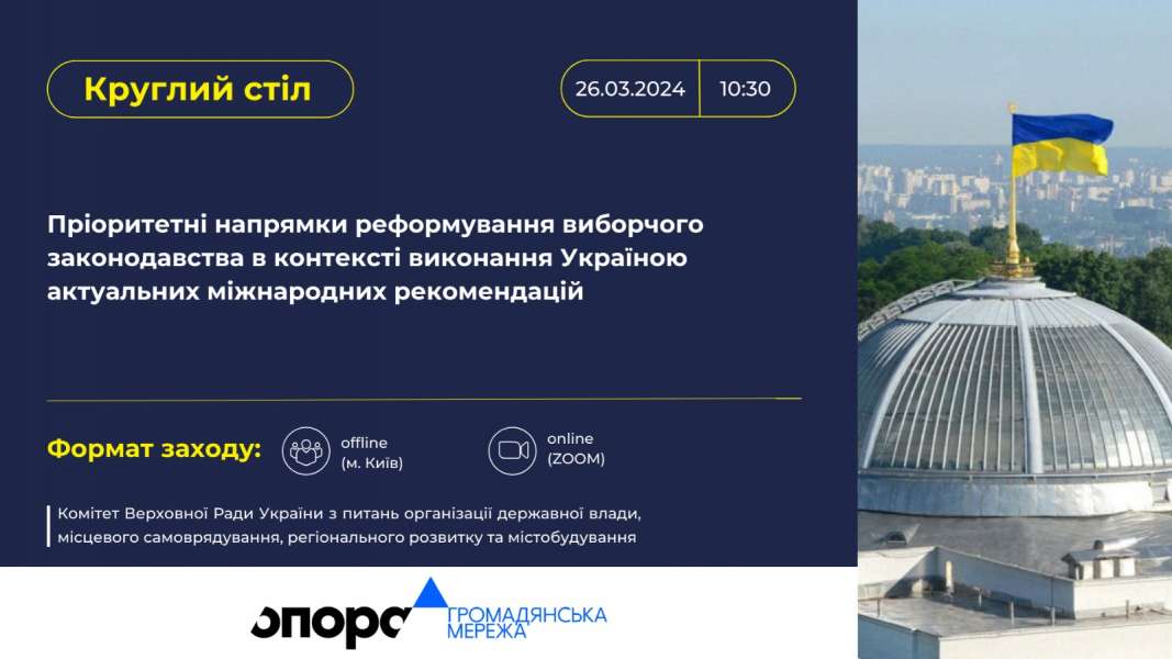 Комітет Верховної Ради України з питань організації державної влади, місцевого самоврядування, регіонального розвитку та містобудування проведе круглий стіл на тему: «Пріоритетні напрямки реформування виборчого законодавства в контексті виконання Україною актуальних міжнародних рекомендацій».
