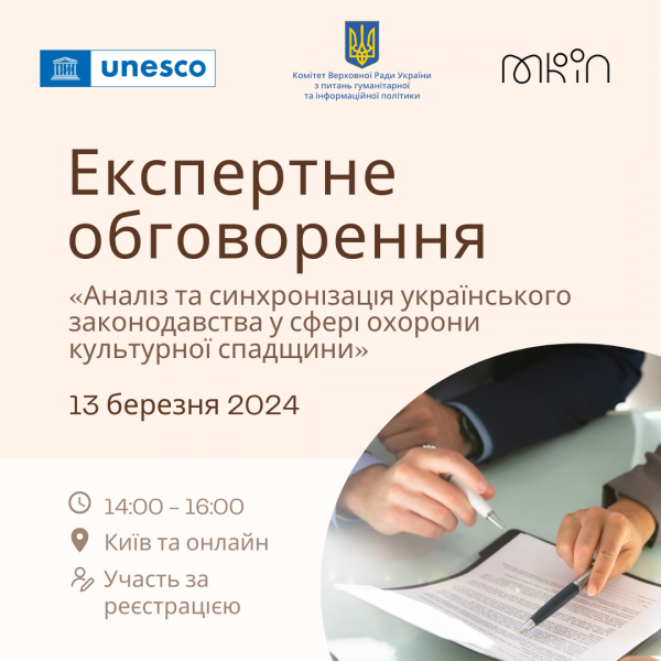 Комітет Верховної Ради України з питань гуманітарної та інформаційної політики у співпраці з Бюро ЮНЕСКО в Україні й Міністерством культури та інформаційної політики України запрошує представників сфери охорони культурної спадщини на публічну презентацію спільного проєкту з питань аналізу і синхронізації українського законодавства у сфері охорони культурної спадщини, а також до обговорення поточного стану нормативно-правової бази з охорони та управління культурною спадщиною, пріоритетів і прогалин з метою внесення відповідних змін до законодавства.