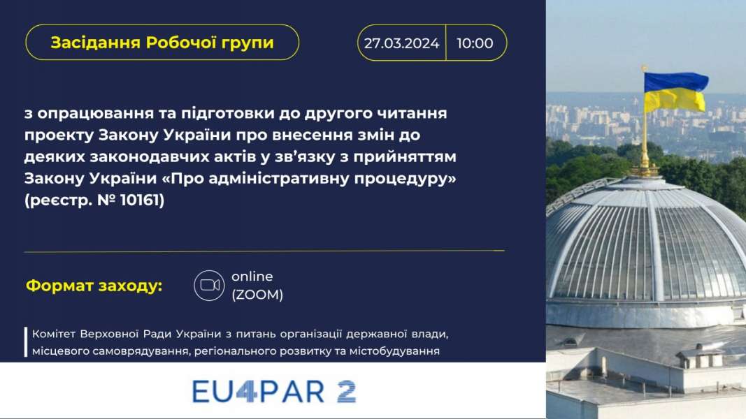 У Комітеті Верховної Ради України з питань організації державної влади, місцевого самоврядування, регіонального розвитку та містобудування у режимі відеоконференції на платформі ZOOM у відбудеться перше засідання Робочої групи з опрацювання та підготовки до другого читання проекту Закону України про внесення змін до деяких законодавчих актів у зв’язку з прийняттям Закону України «Про адміністративну процедуру» (реєстр. № 10161).