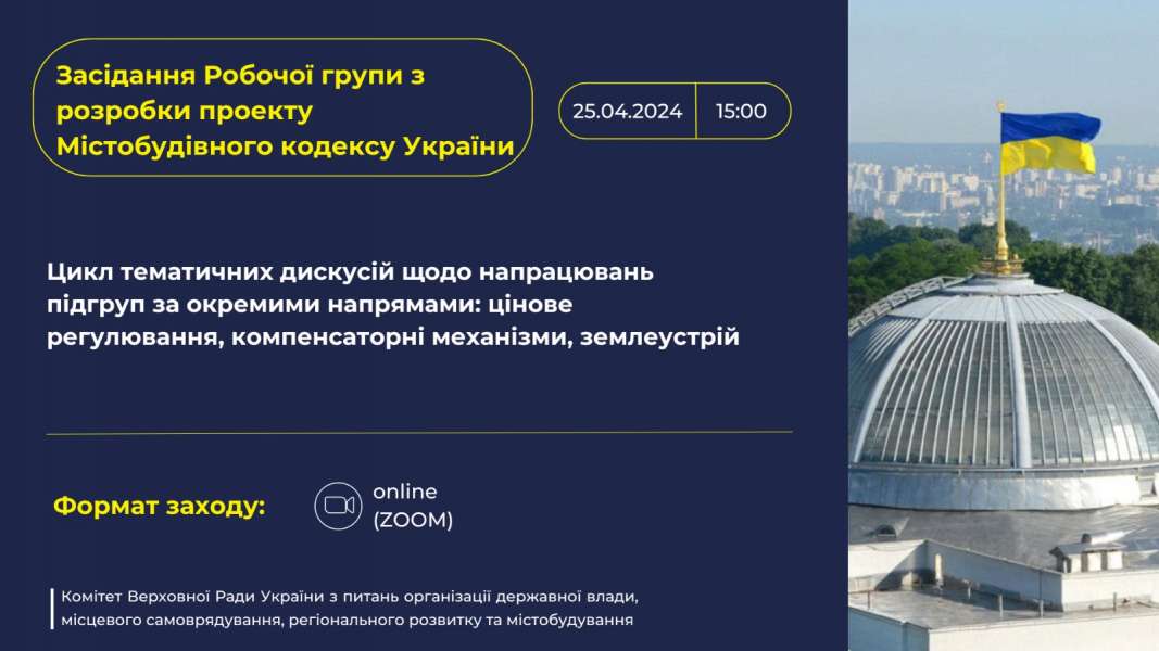 Комітет Верховної Ради України з питань організації державної влади, місцевого самоврядування, регіонального розвитку та містобудування проведе 32-е засідання Робочої групи з розробки проекту Містобудівного кодексу України на тему: «Цикл тематичних дискусій щодо напрацювань підгруп за окремими напрямами: цінове регулювання, компенсаторні механізми, землеустрій».