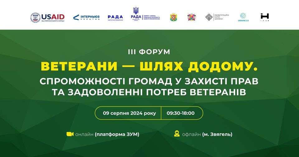 Комітет Верховної Ради України з питань соціальної політики та захисту прав ветеранів спільно з Міжфракційним депутатським об'єднанням «Реабілітаційні сили України», Житомирською обласною військовою адміністрацією, Звягельською міською радою, ГО «Україна 2.0.», iHUB та за підтримки Програми USAID «Рада: наступне покоління» організовують ІІІ Форум «Ветерани - шлях додому: спроможності громад у захисті прав та задоволенні потреб ветеранів».
