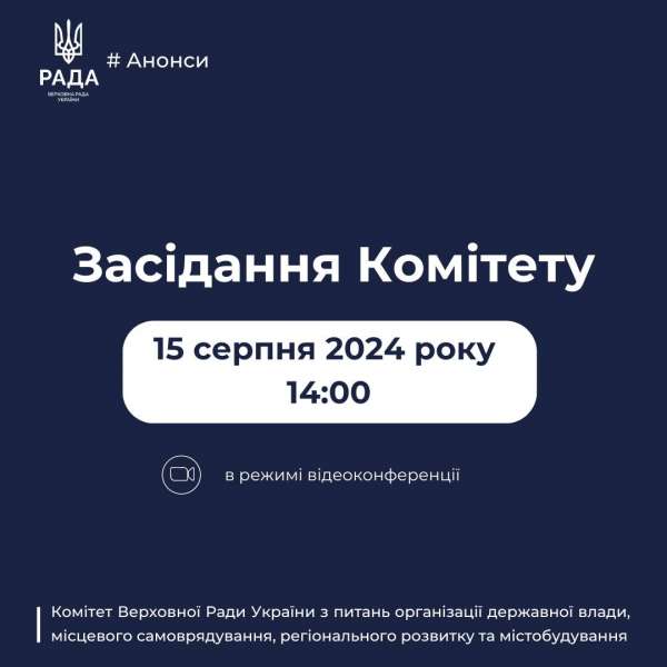 Комітет Верховної Ради України з питань організації державної влади, місцевого самоврядування, регіонального розвитку та містобудування проведе чергове засідання у режимі відеоконференції.