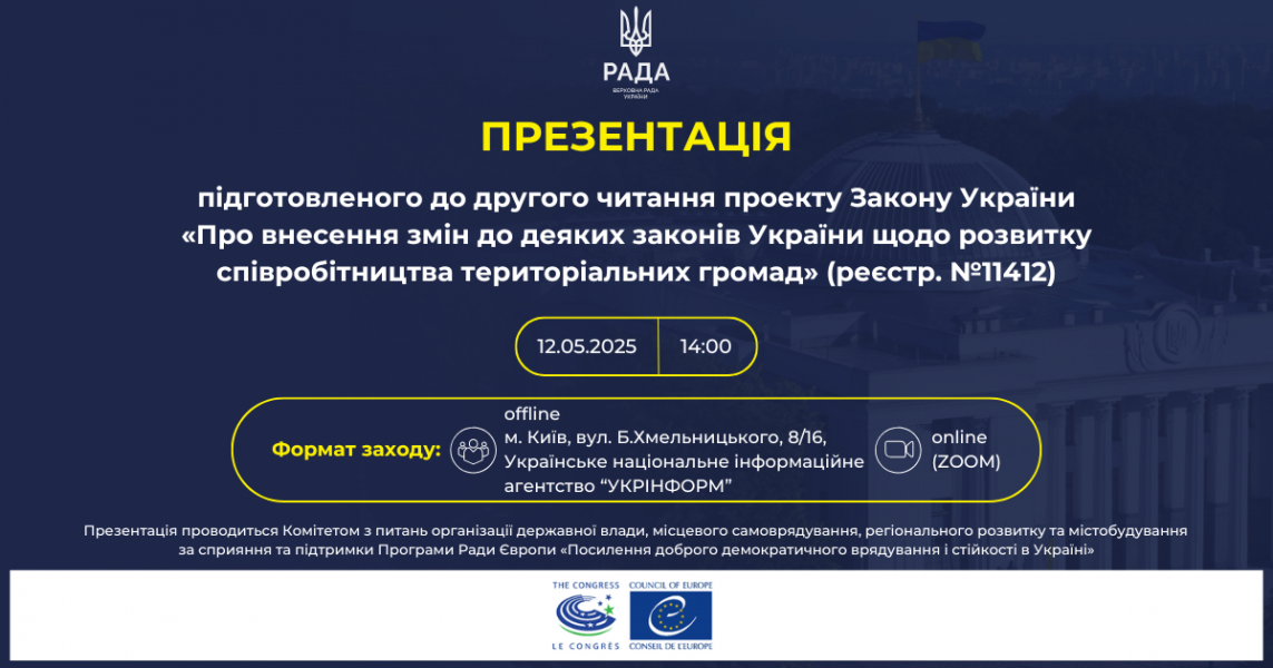 Комітет Верховної Ради України з питань організації державної влади, місцевого самоврядування, регіонального розвитку та містобудування проведе Презентацію підготовленого до другого читання проекту Закону України «Про внесення змін до деяких законів України щодо розвитку співробітництва територіальних громад» (реєстр. №11412).