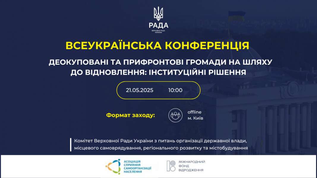Комітет Верховної Ради України з питань організації державної влади, місцевого самоврядування, регіонального розвитку та містобудування проведе Всеукраїнську конференцію «Деокуповані та прифронтові громади на шляху до відновлення: інституційні рішення» .