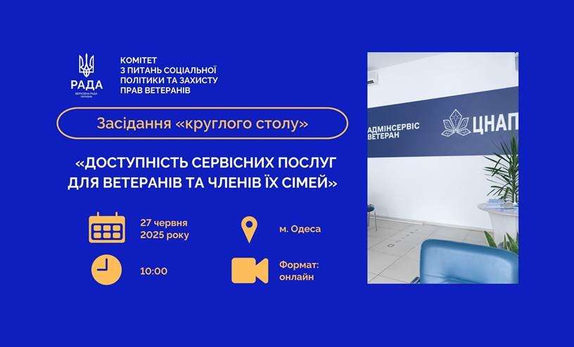 Комітет Верховної Ради України з питань соціальної політики та захисту прав ветеранів проведе засідання «круглого столу» на тему: «Доступність сервісних послуг для ветеранів та членів їх сімей» у змішаному форматі (з використанням режиму відеоконференції на платформі ZOOM) у м.Одесі.
