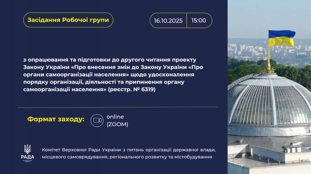 Комітет Верховної Ради України з питань організації державної влади, місцевого самоврядування, регіонального розвитку та містобудування проведе засідання Робочої групи з опрацювання та підготовки до другого читання проекту Закону України «Про внесення змін до Закону України «Про органи самоорганізації населення» щодо удосконалення порядку організації, діяльності та припинення органу самоорганізації населення» (реєстр. № 6319).