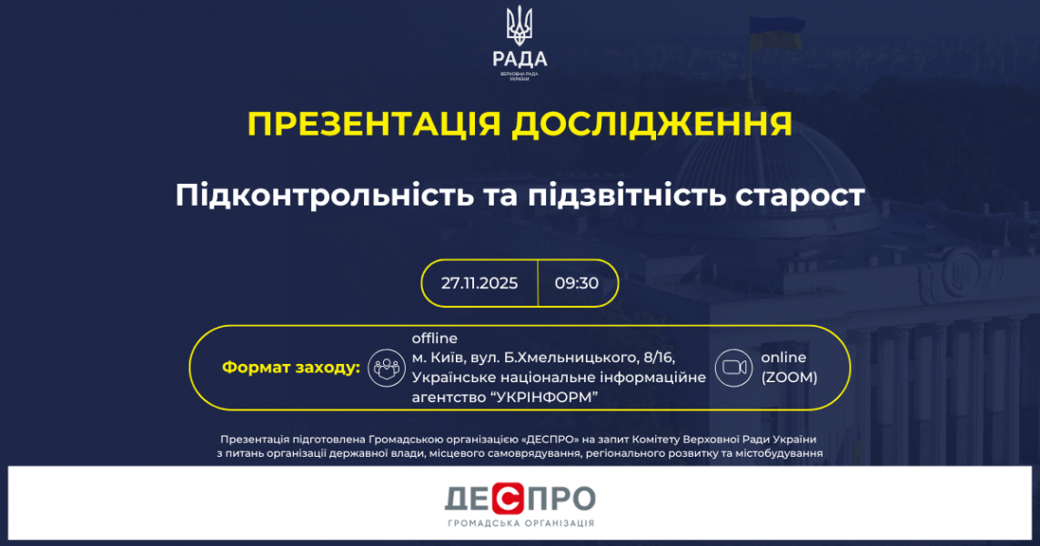 Комітет Верховної Ради України з питань організації державної влади, місцевого самоврядування, регіонального розвитку та містобудування проведе презентацію дослідження «Підконтрольність та підзвітність старост», підготовленого Громадською організацією «ДЕСПРО».