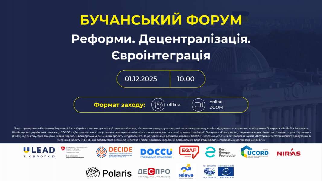 Комітет з питань організації державної влади, місцевого самоврядування, регіонального розвитку та містобудування проведе щорічний Бучанський форум «Реформи. Децентралізація. Євроінтеграція».