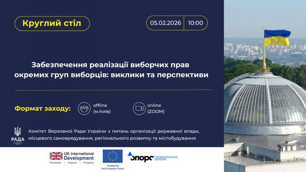 Комітет Верховної Ради України з питань організації державної влади, місцевого самоврядування, регіонального розвитку та містобудування спільно з Всеукраїнською громадською організацією «Громадянська мережа «ОПОРА» проведе круглий стіл на тему: «Забезпечення реалізації виборчих прав окремих груп виборців: виклики та перспективи».