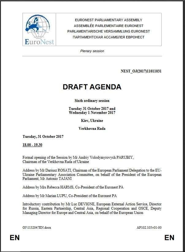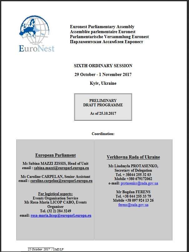 У неділю, 29 жовтня, з 11.00 до 12.30 у приміщенні Верховної Ради України проходитиме засідання секретаріату ПА ЄВРОНЕСТ. О 18 годині розпочнеться зустріч представників делегацій Східноєвропейського компоненту ПА ЄВРОНЕСТ.