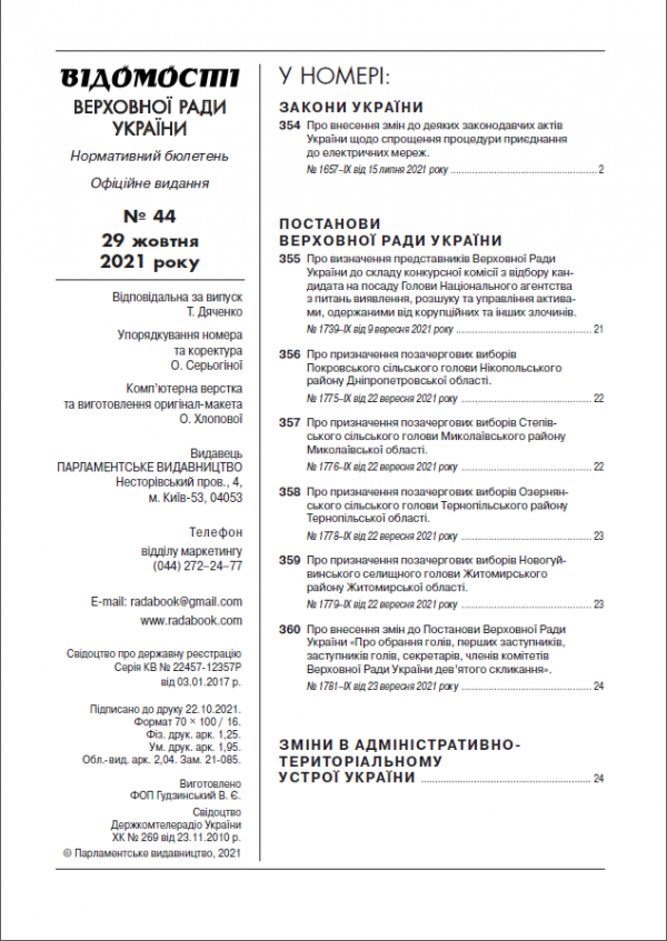 У черговому номері збірника нормативно-правових актів парламентського видавництва «Відомості Верховної Ради України» №44 від 29 жовтня 2021 року опубліковано закон і постанови, прийняті під час п’ятої сесії Верховної Ради дев’ятого скликання.