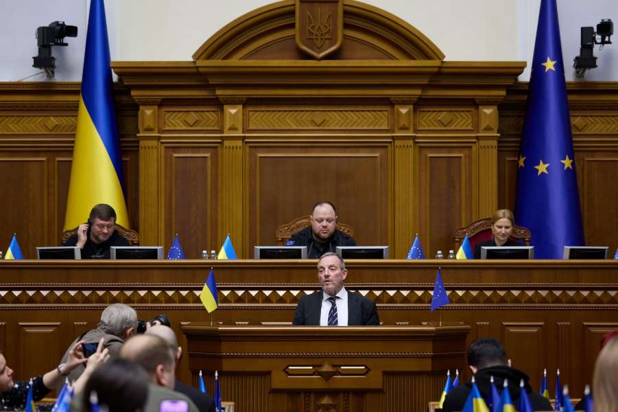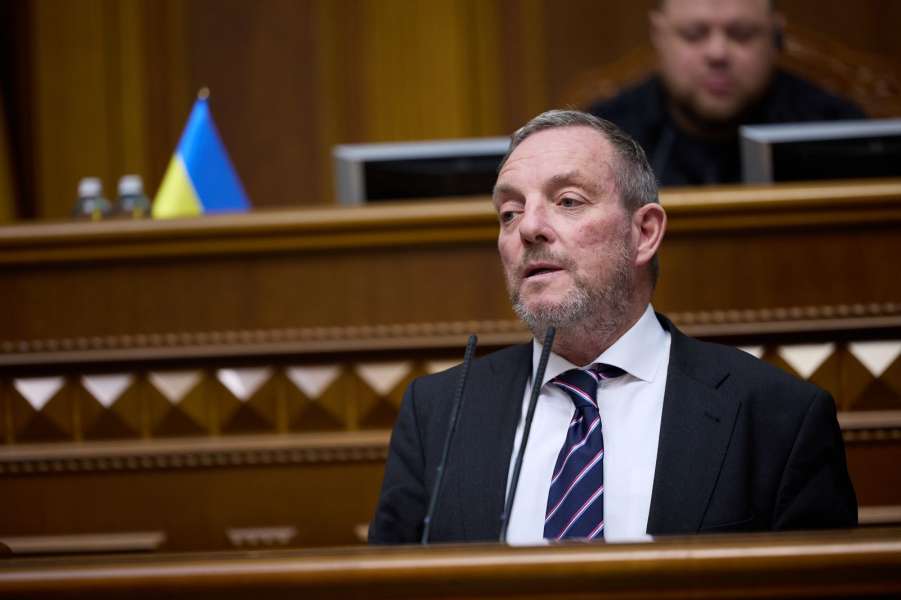 Шановні друзі, я дуже радий сказати вам, що торік у листопаді ми ухвалили постанову, підтримуючи ваш народ, стаючи з вами пліч-о-пліч. Пане Голово, ваш поступ у всьому світі демонструє пристрасть і снагу українського народу й ми схиляємося та складаємо пошану вашій мужності. Нам легко виступати від інших парламентів і бути тут. Просто переїзд потягом — це ніщо проти того, що доводиться переживати вам через цю навалу. І ось ми приїхали, щоби згадати тих мужніх оборонців України, які тепер воюють у складі ваших Сил безпеки і оборони. І ми вшановуємо тих, хто заплатив своїм життям, і тих, хто зазнав поранень. Ми з вами подумки, ви у наших серцях!