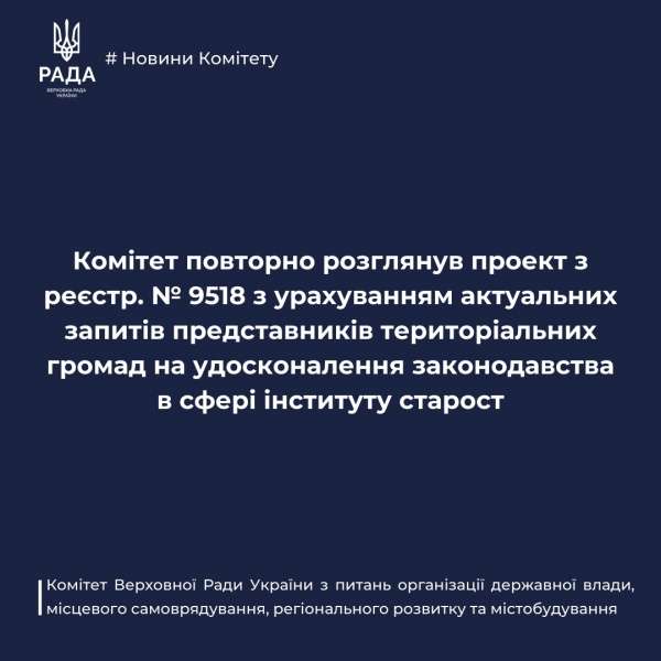 Комітет з питань організації державної влади, місцевого самоврядування, регіонального розвитку та містобудування 18 квітня 2024 року повторно розглянув проект Закону України про внесення змін до Закону України «Про місцеве самоврядування в Україні» щодо вдосконалення правового регулювання інституту старост та його діяльності в умовах воєнного стану (реєстр. №9518).